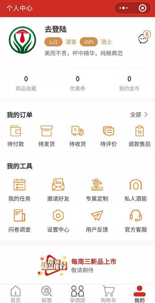 家酒网会员分销线上平台由四川初心不二科技提供技术支持,主要有平台会员、享酒会员、二级分销、每日签到、做任务得金币、邀请好友、问卷调查、优惠卷等功能,如下是家酒网会员分销小程序界面截图,如果您想体验可在小程序中搜索 家酒网