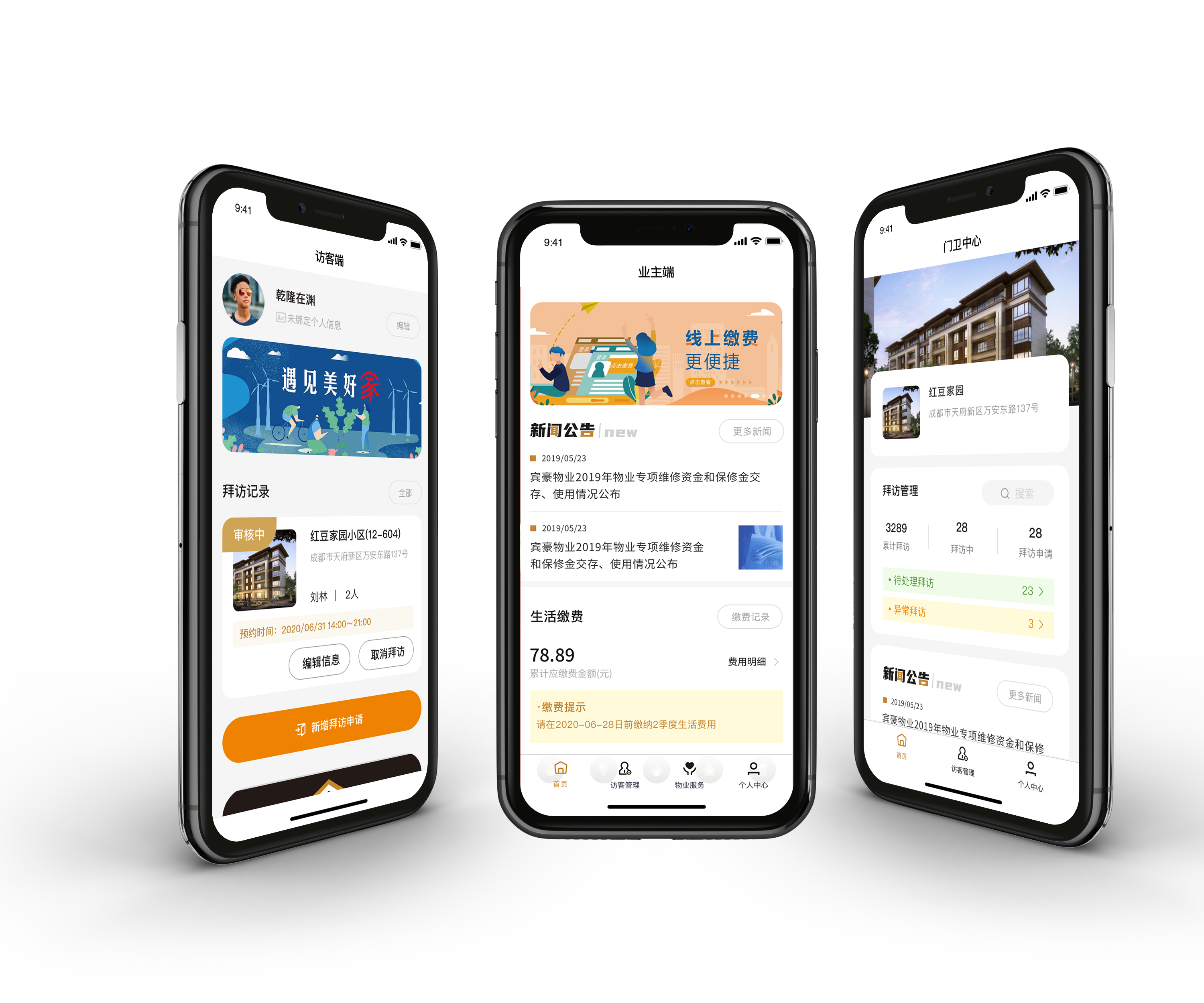宾豪物业管理系统前端做的是公众号,主要是用于访客,如果有访客可提前在公众号增加拜访申请,还有住户以及门岗管理,如想体验功能可在微信搜索公众号 宾豪物业。如果您也想开发类似物业管理系统可以联系小编获得详细方案报价。